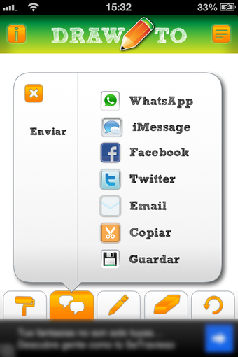Una vez termines tu obra de arte, DrawTo para WhatsApp te permite compartirla a través de WhatsApp, iMessage, Facebook, Twitter, Email, copiarlo o guardarlo en la página de DrawTo o en tu Carrete de iPhone.